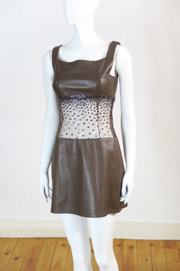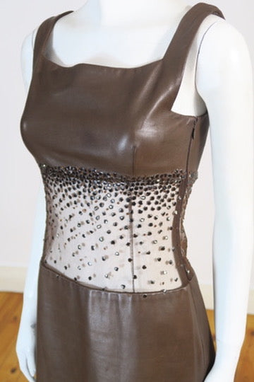 Atelier Versace Haute Couture spring summer 1996 runway mini dress. Brown lambskin leather, brown crystal embroidered on the tulle. Size xsmall.