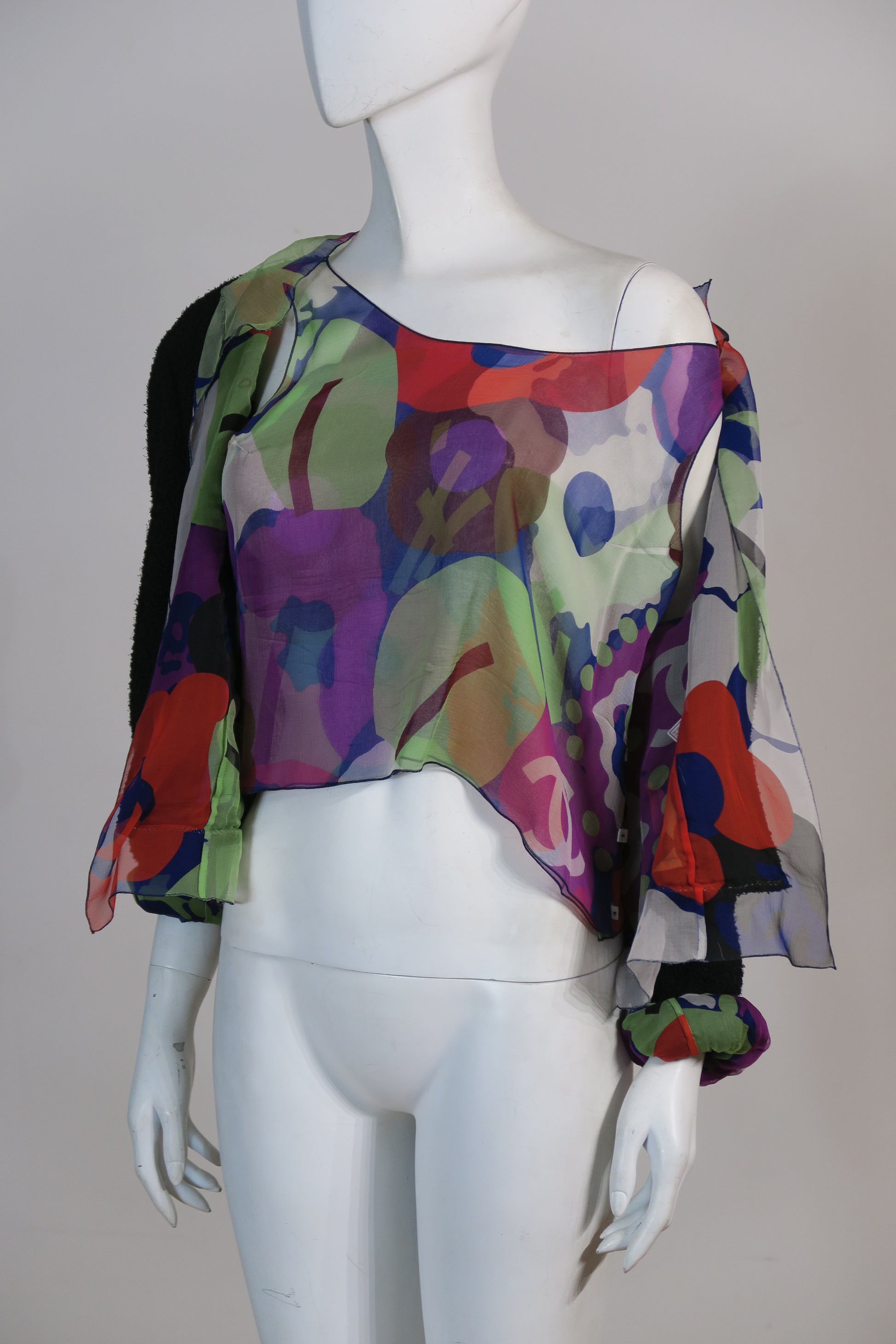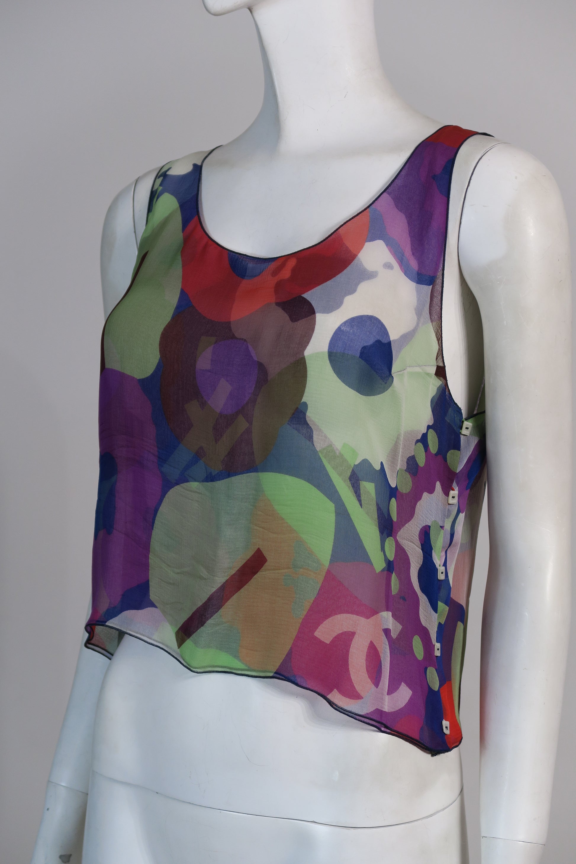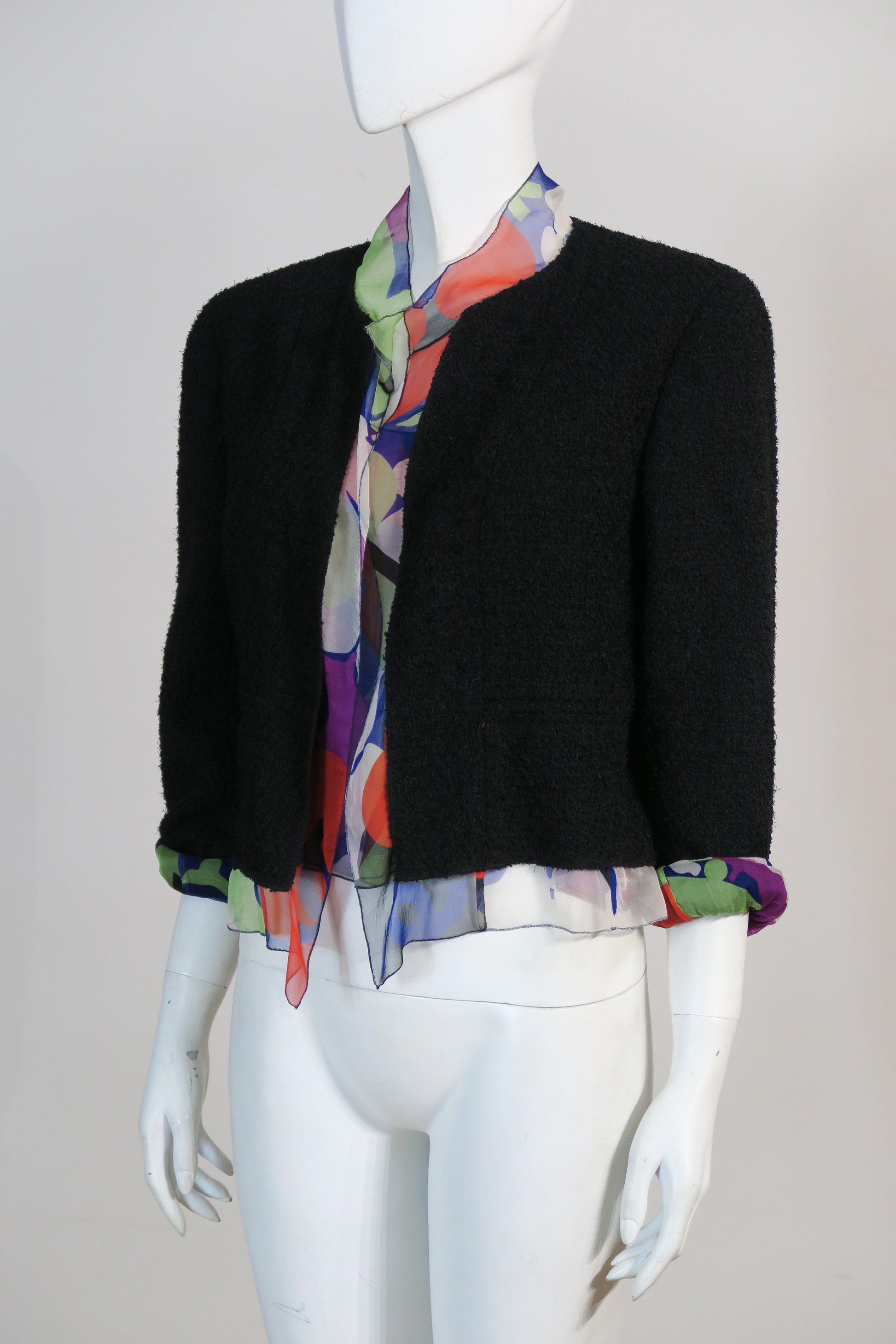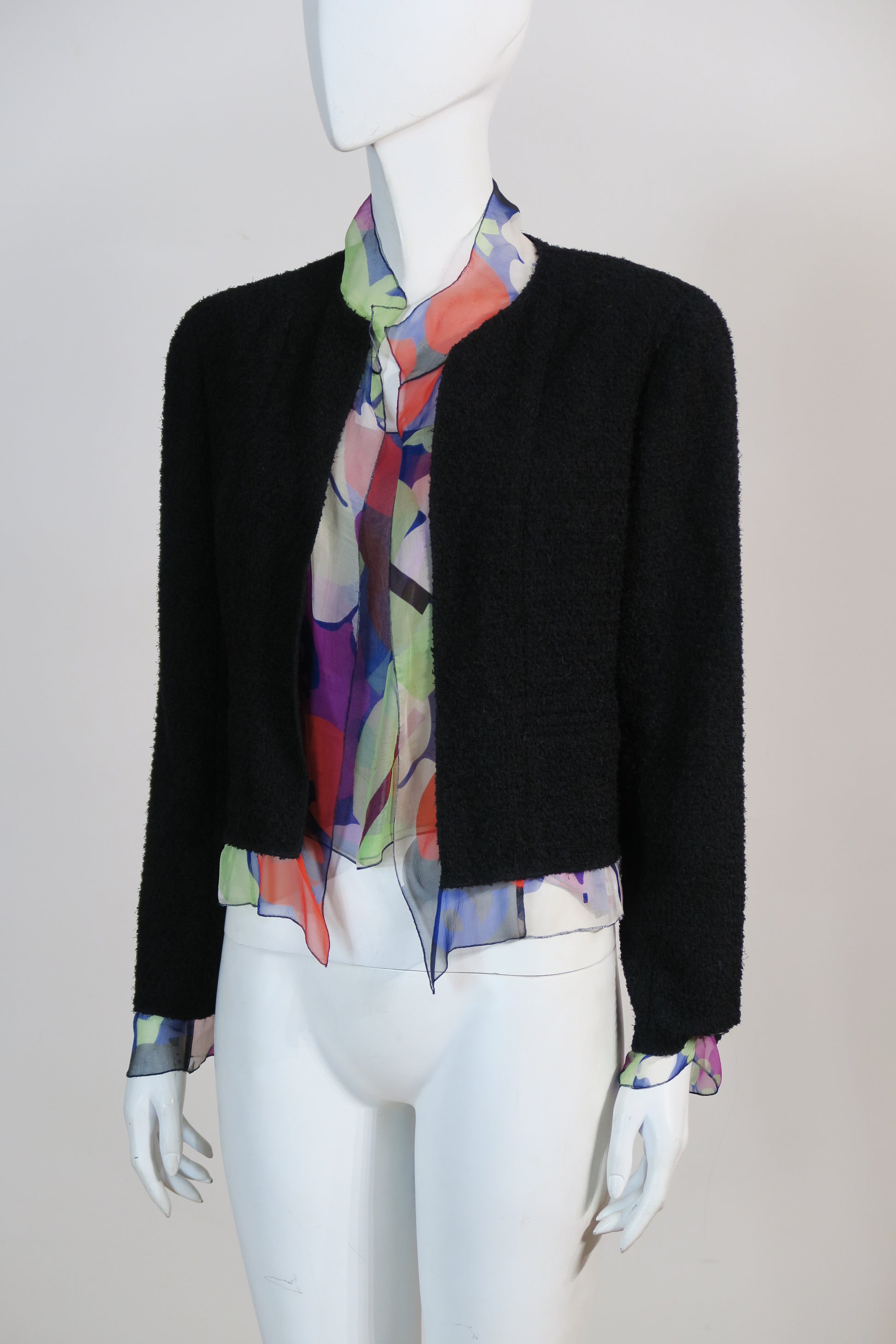 Chanel twin set, included a black tweed jacket, lined with chiffon silk prints, matching the tank tunique top. Size small. From 2000.