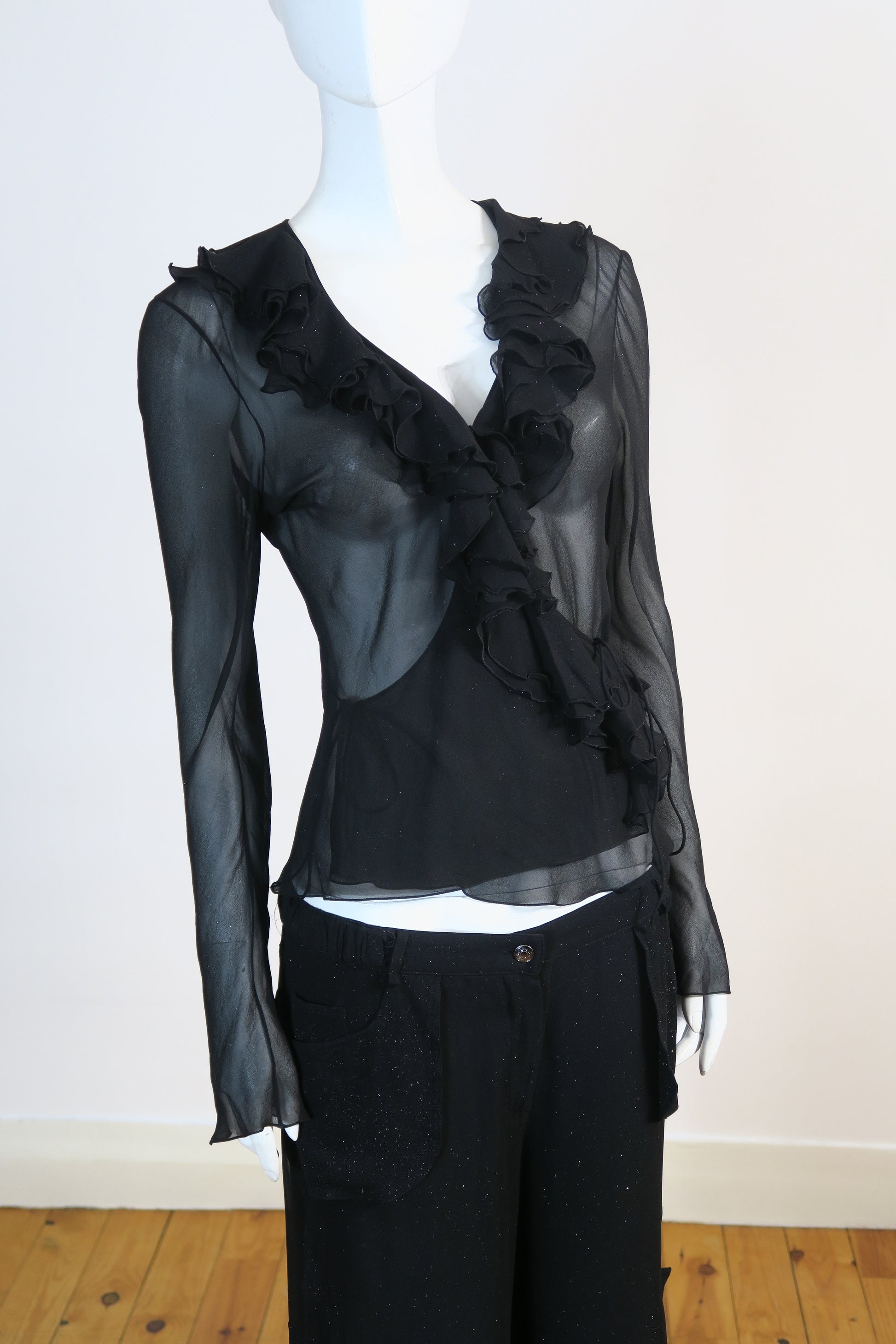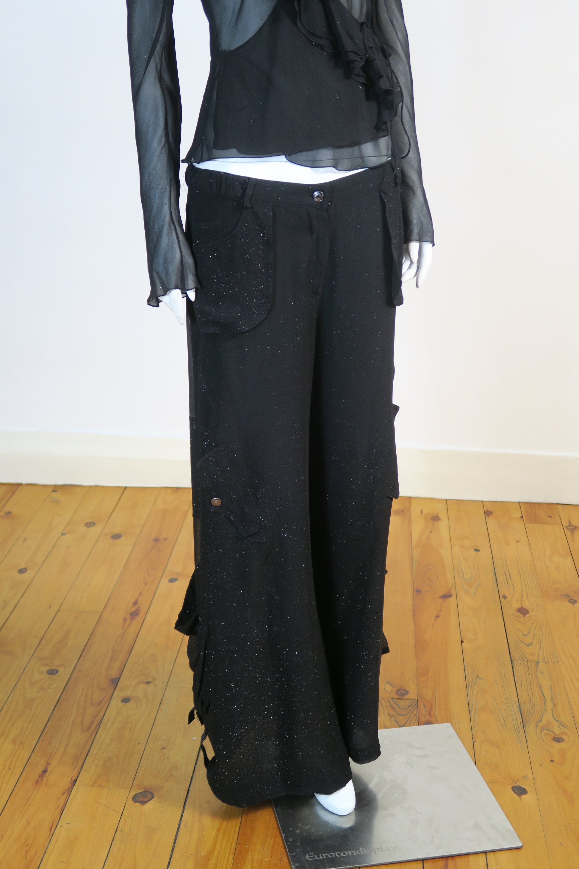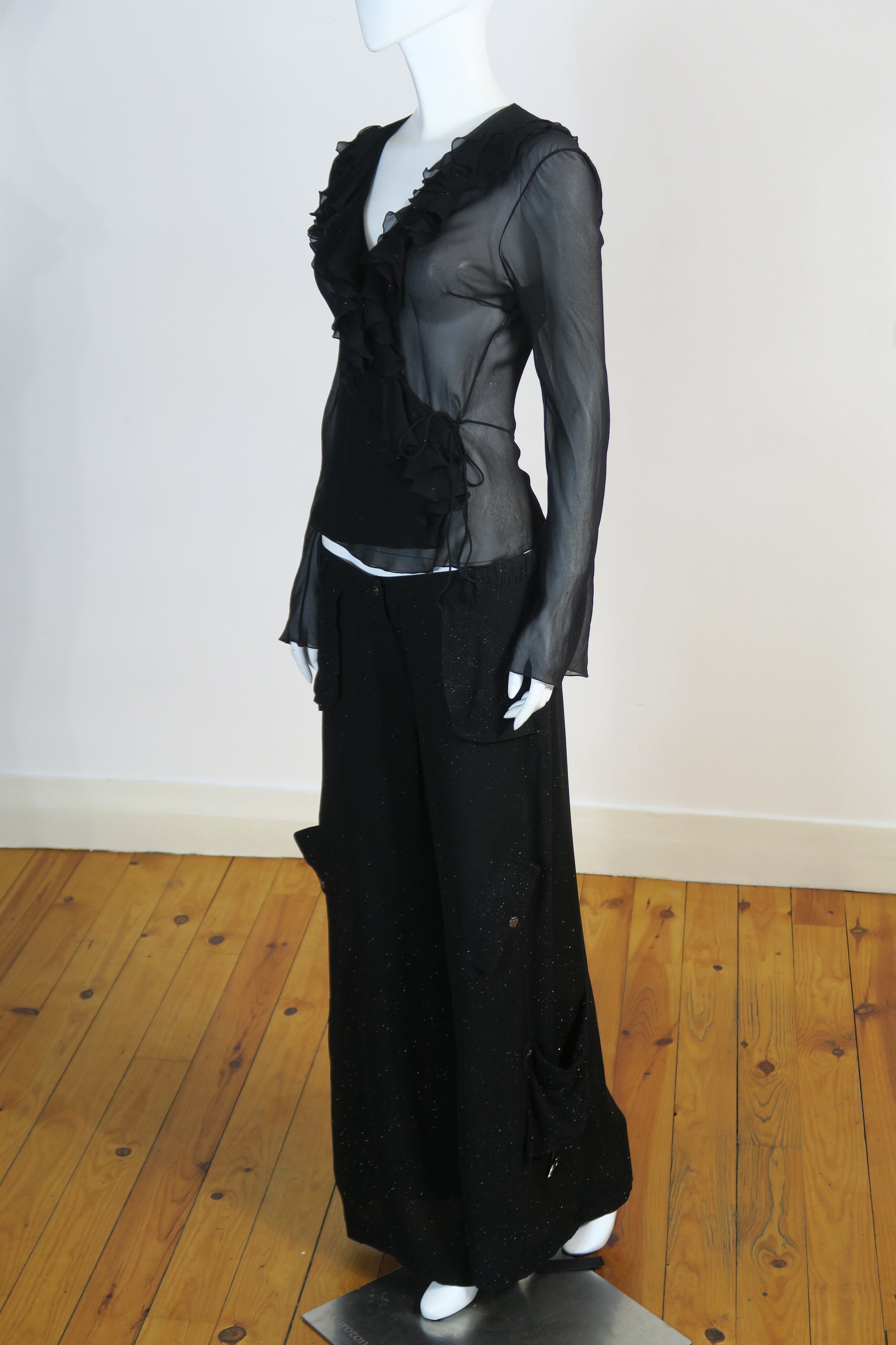 Dior fall winter 2003 silk ruffles sparkly long sleeve top and matching cargo flare pants. Size 40FR, fits medium. Never worn.