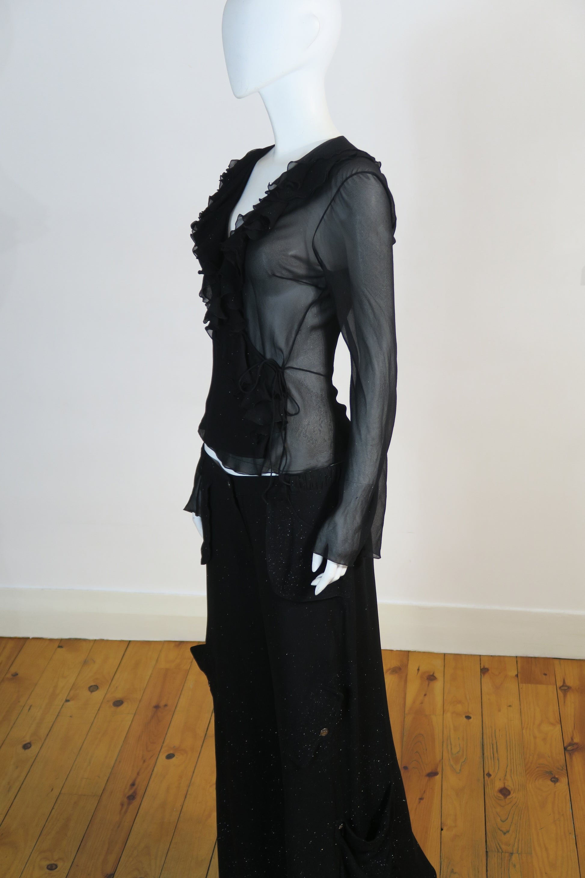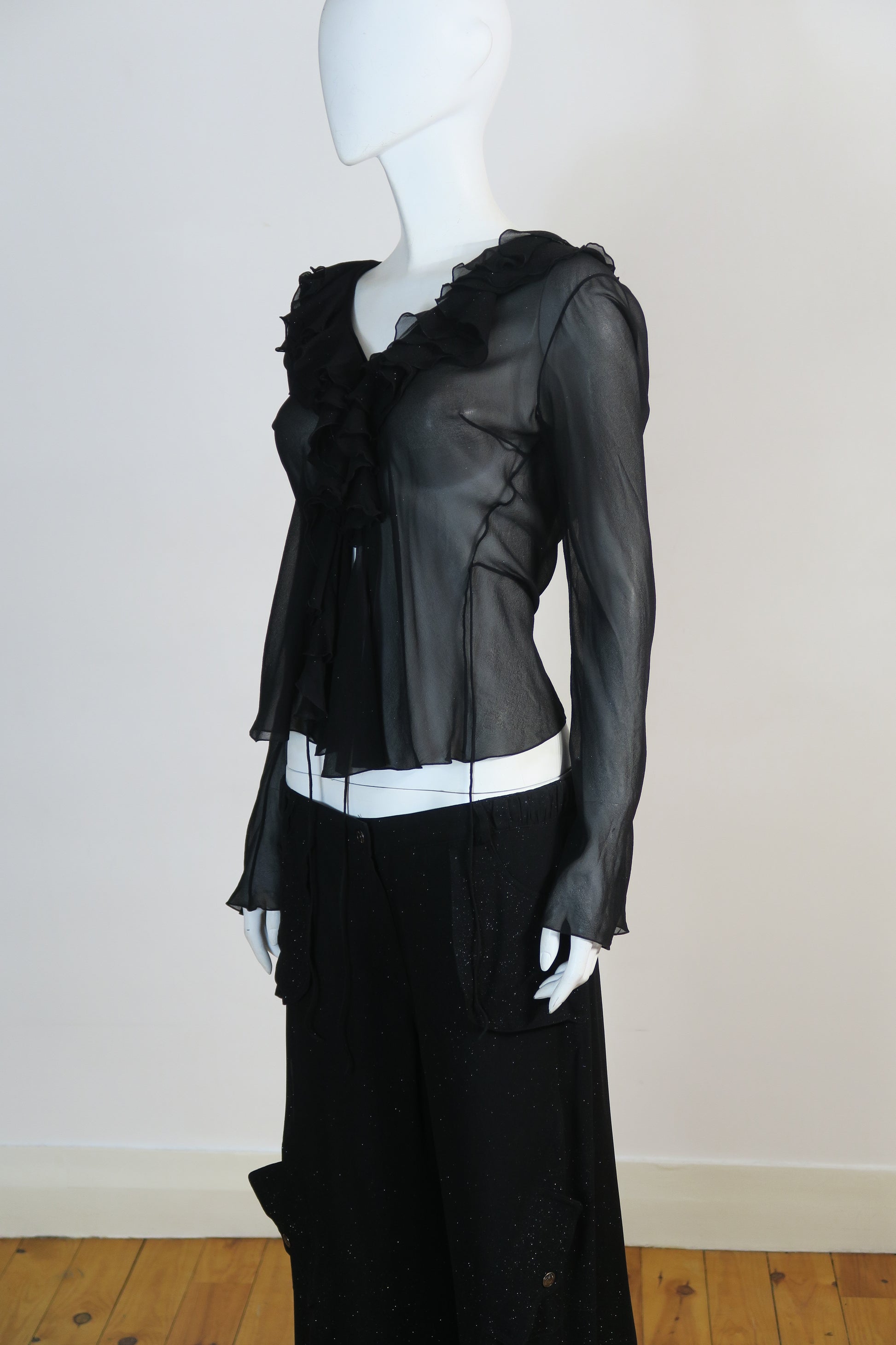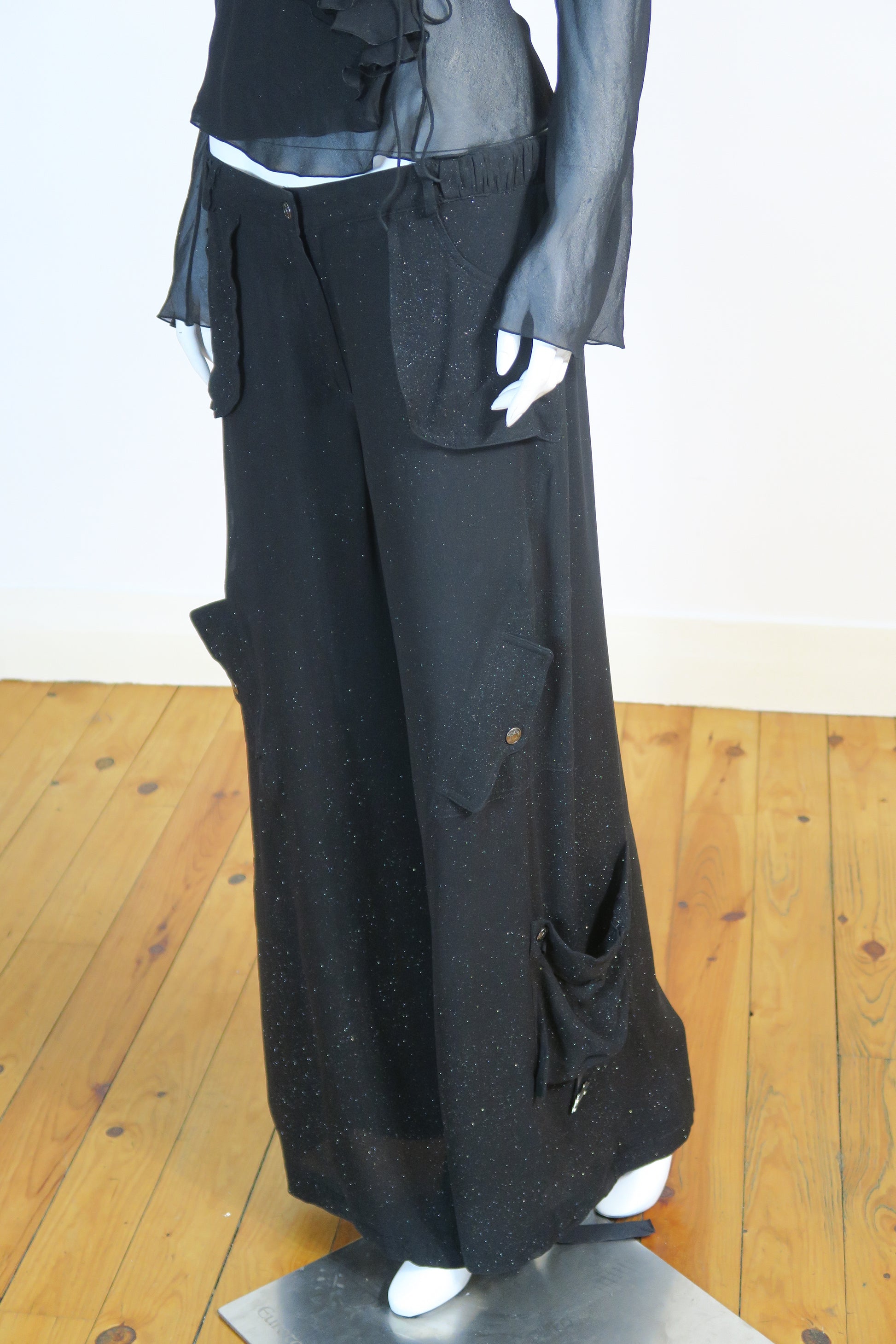Dior fall winter 2003 silk ruffles sparkly long sleeve top and matching cargo flare pants. Size 40FR, fits medium. Never worn.