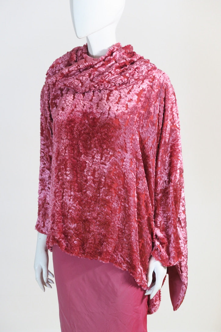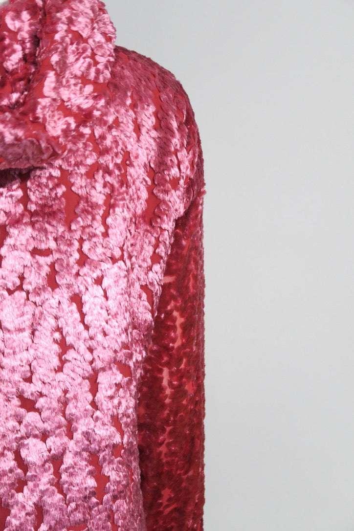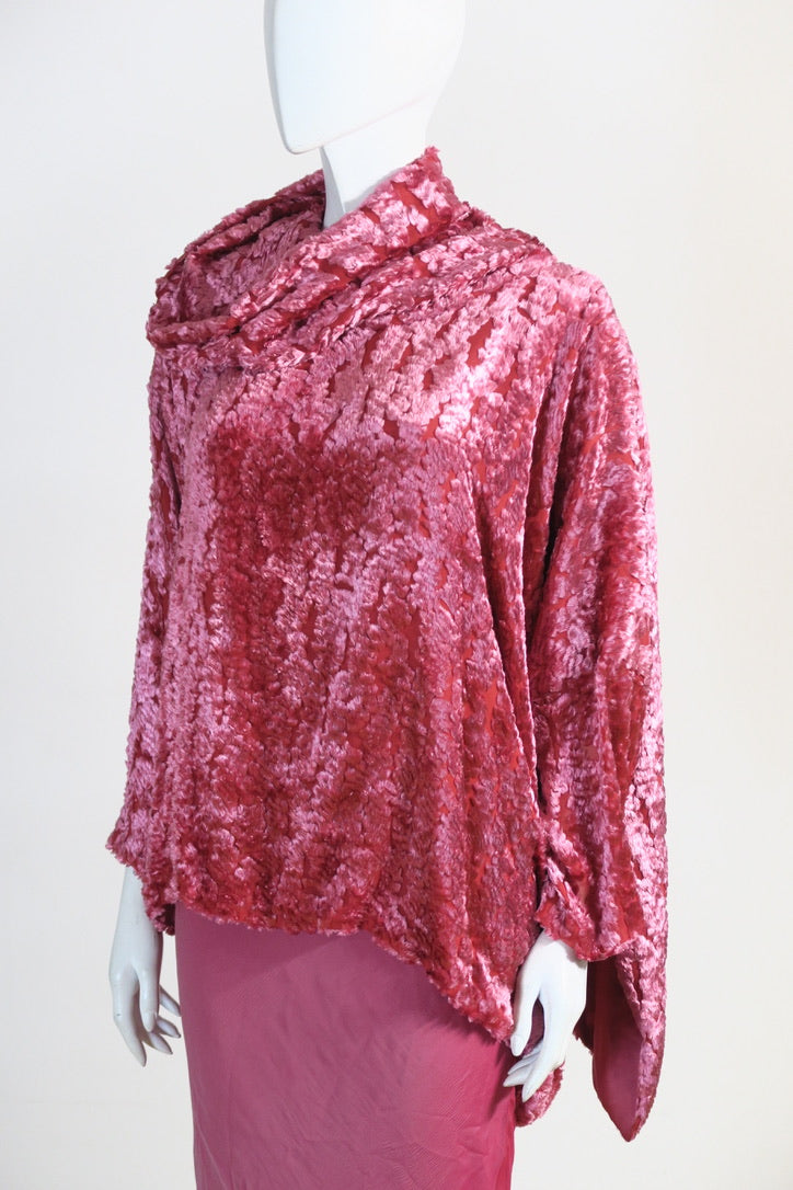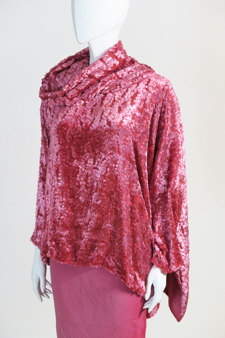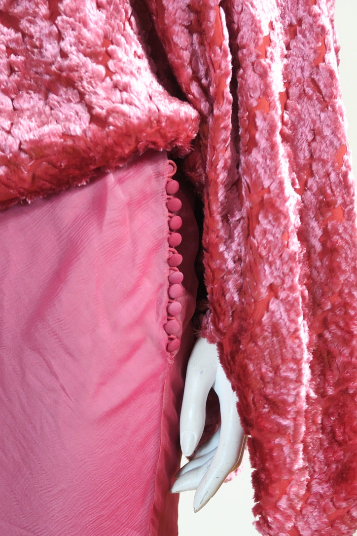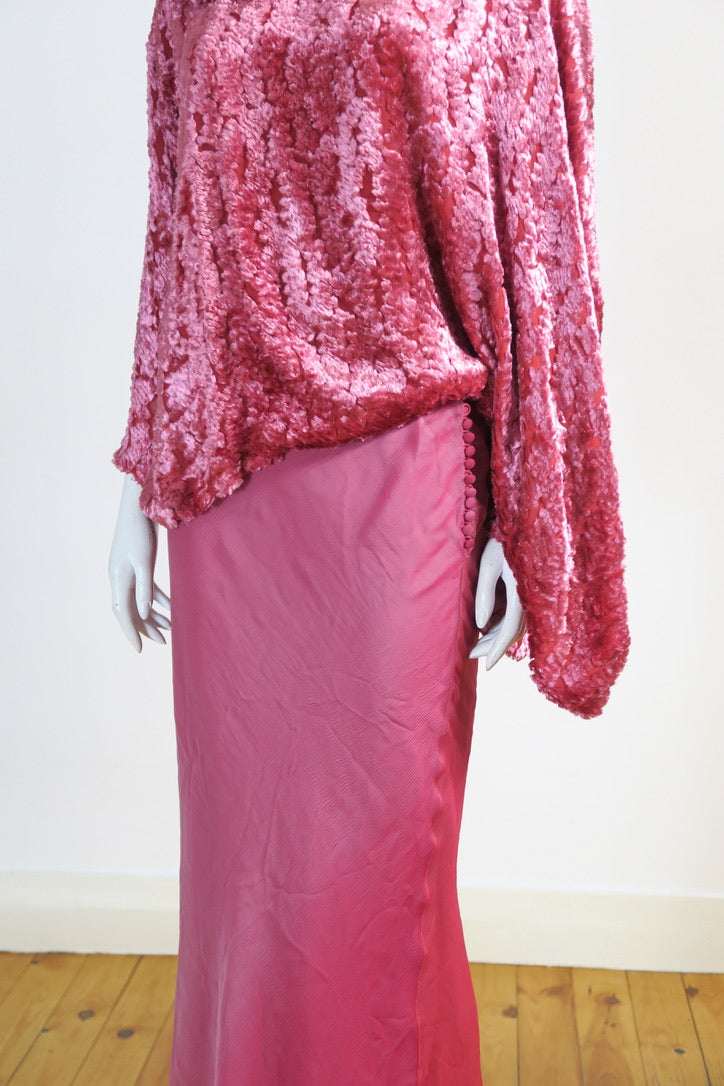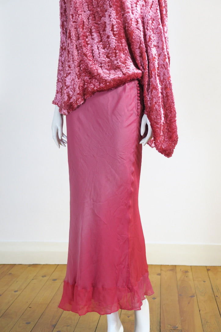 Dior by John Galliano pink set. Pink top from FW 2000, size 36FR, viscose silk trim; silk lining. Oversized pullover, beautiful detailing. Skirt from FW 2004, size 38FR, pure chiffon silk, pink fade, silk covered buttons.