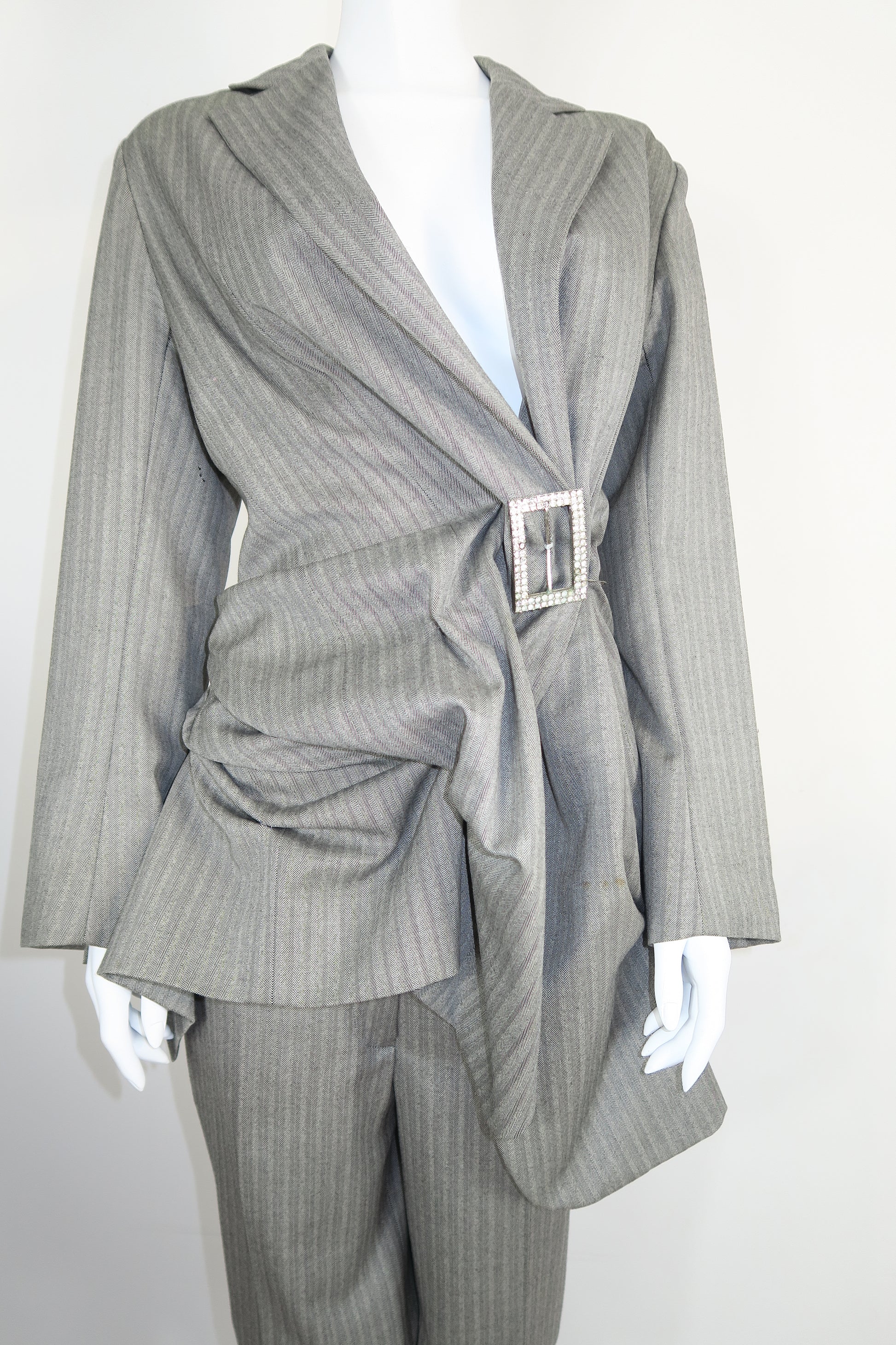 Dior fall winter 2003 runway oversized grey jacket, crystal buckle and pleated back, & matching bermuda pants. Size medium.