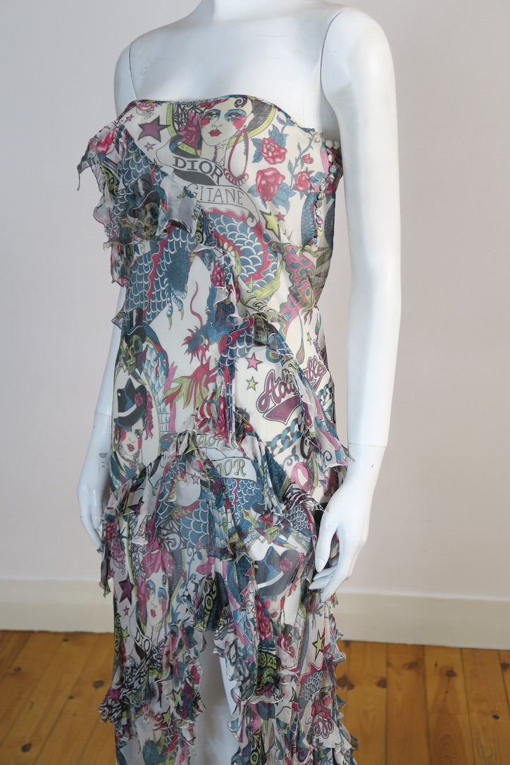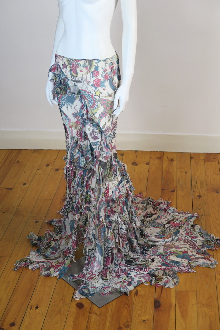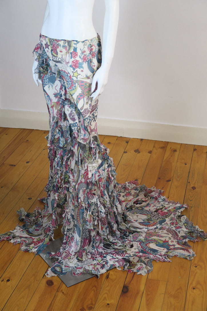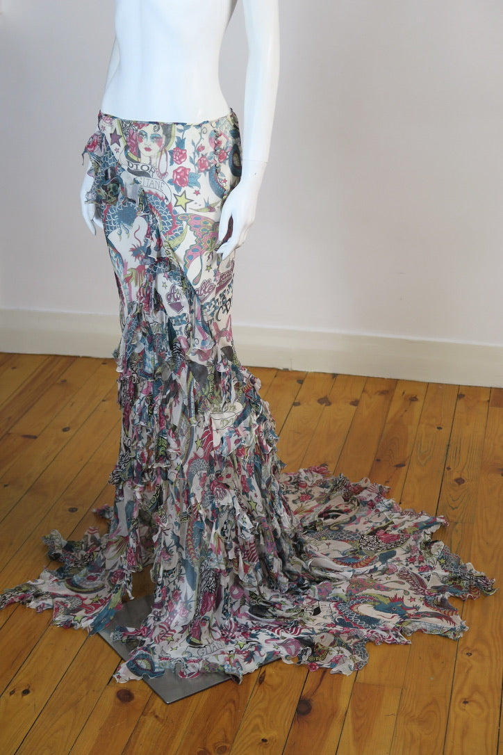 Dior spring summer 2004 'gitane tattoo' printed maxi skirt. Chiffon silk. Beautiful ruffles. Beautiful motion, and detailing. Museum worthy piece. Size small. Can be worn as a dress.