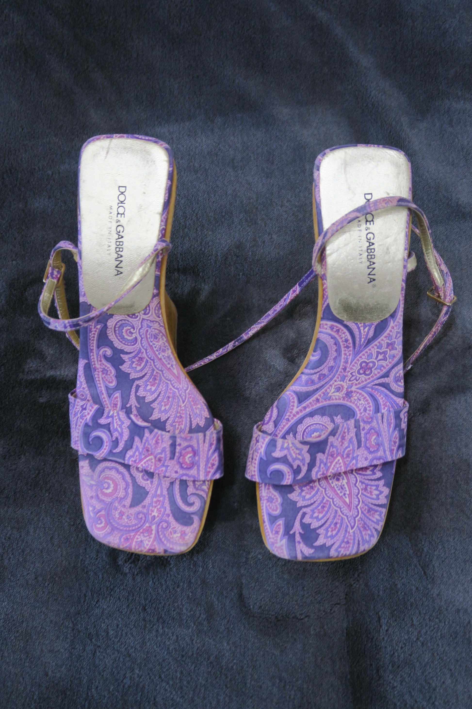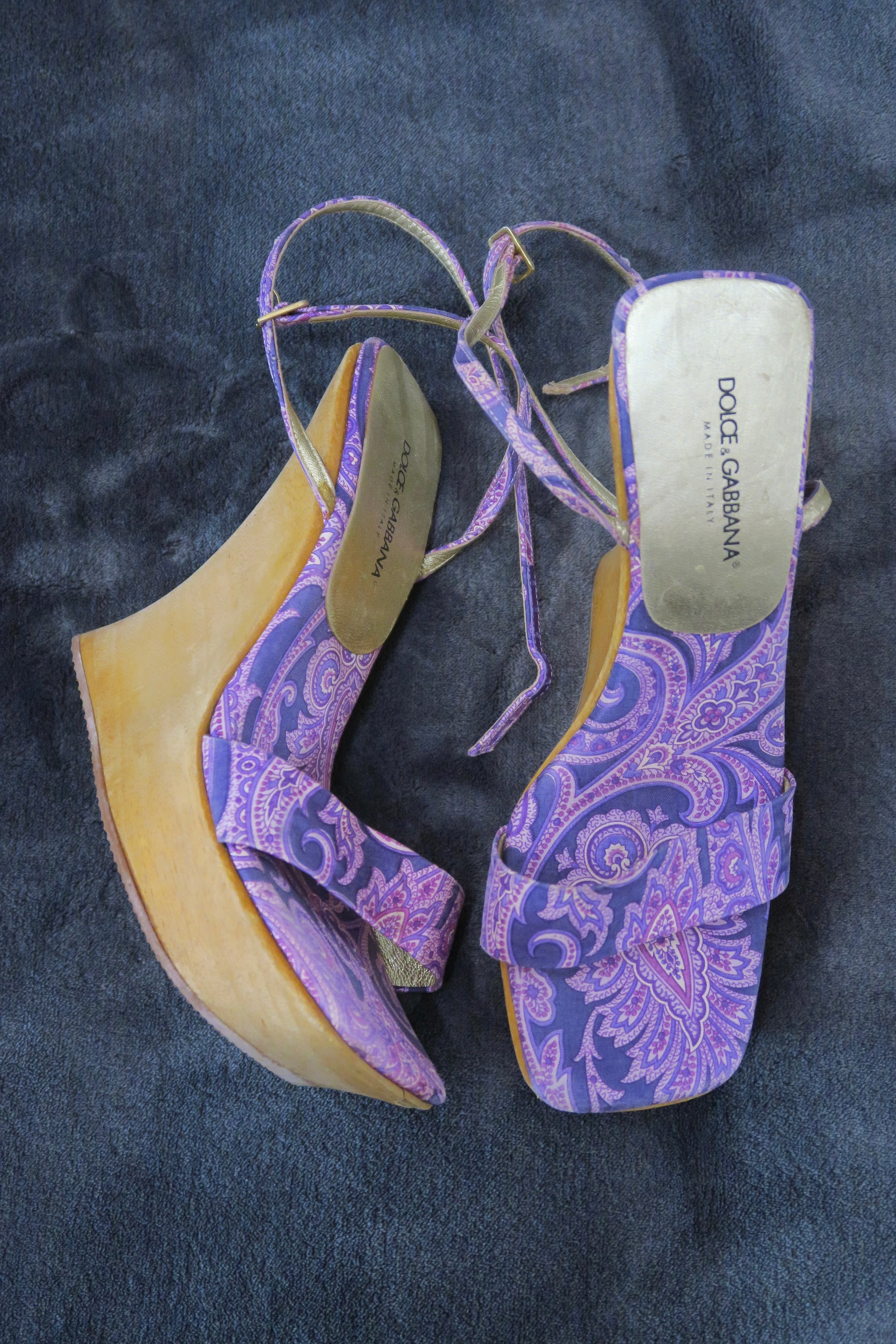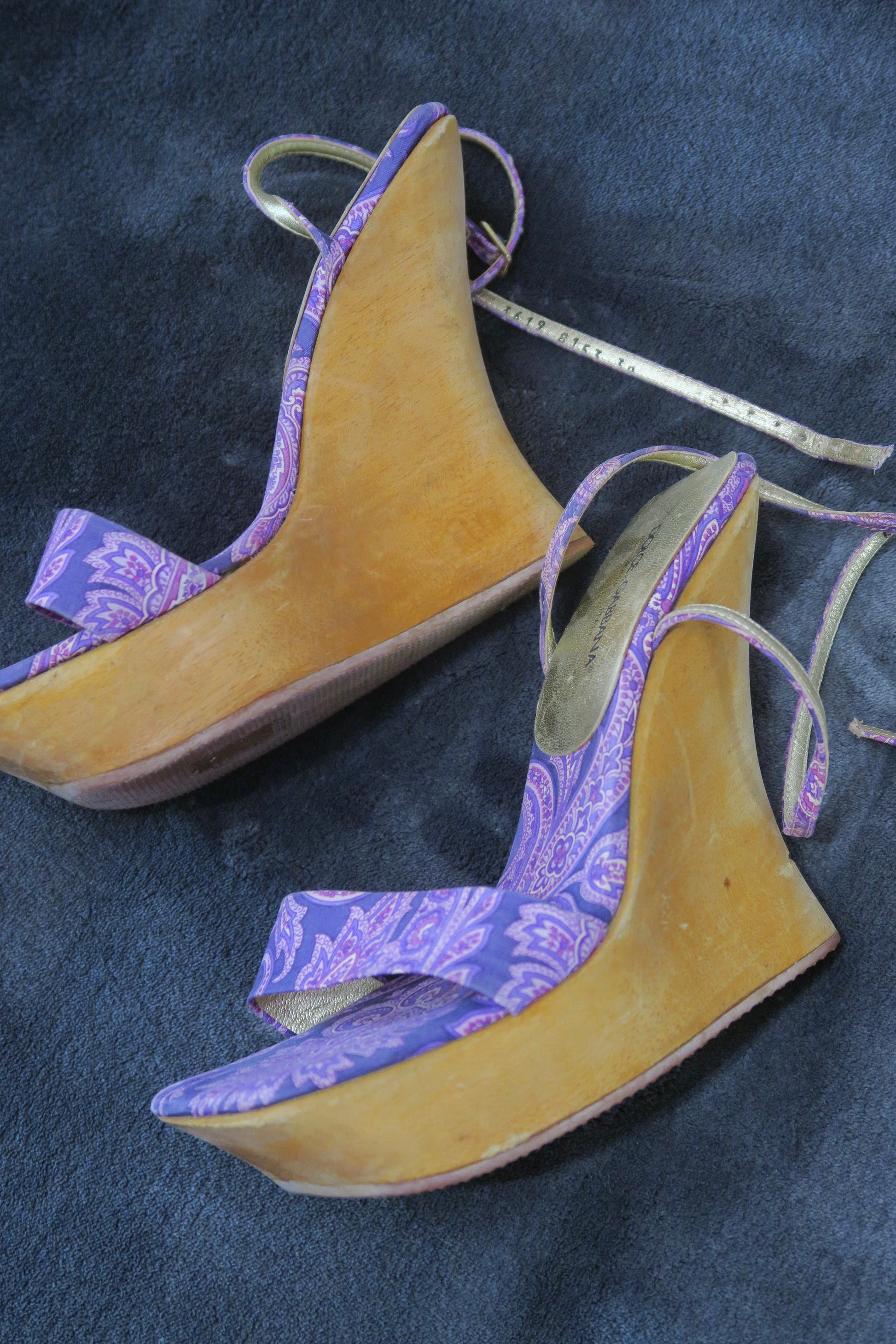 Dolce & Gabbana platform wooden heels, purple bandana print, runway print. Size 37.