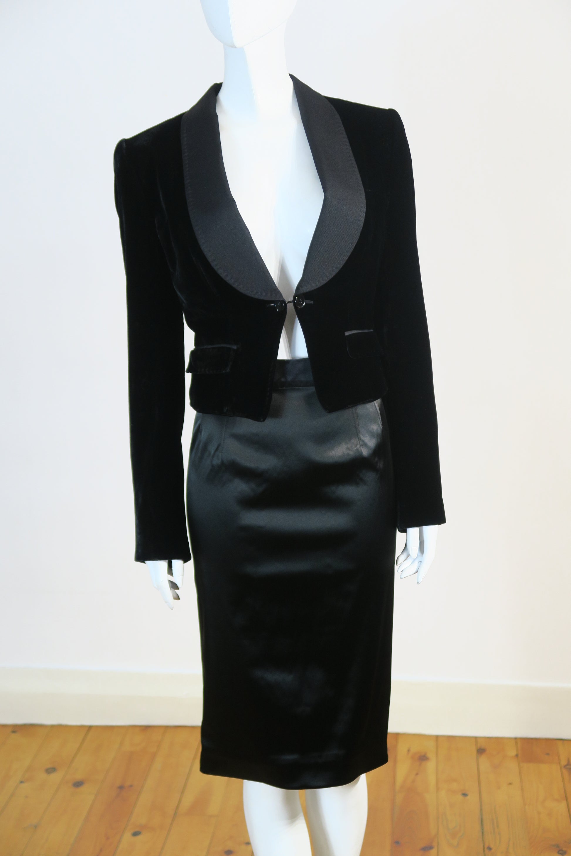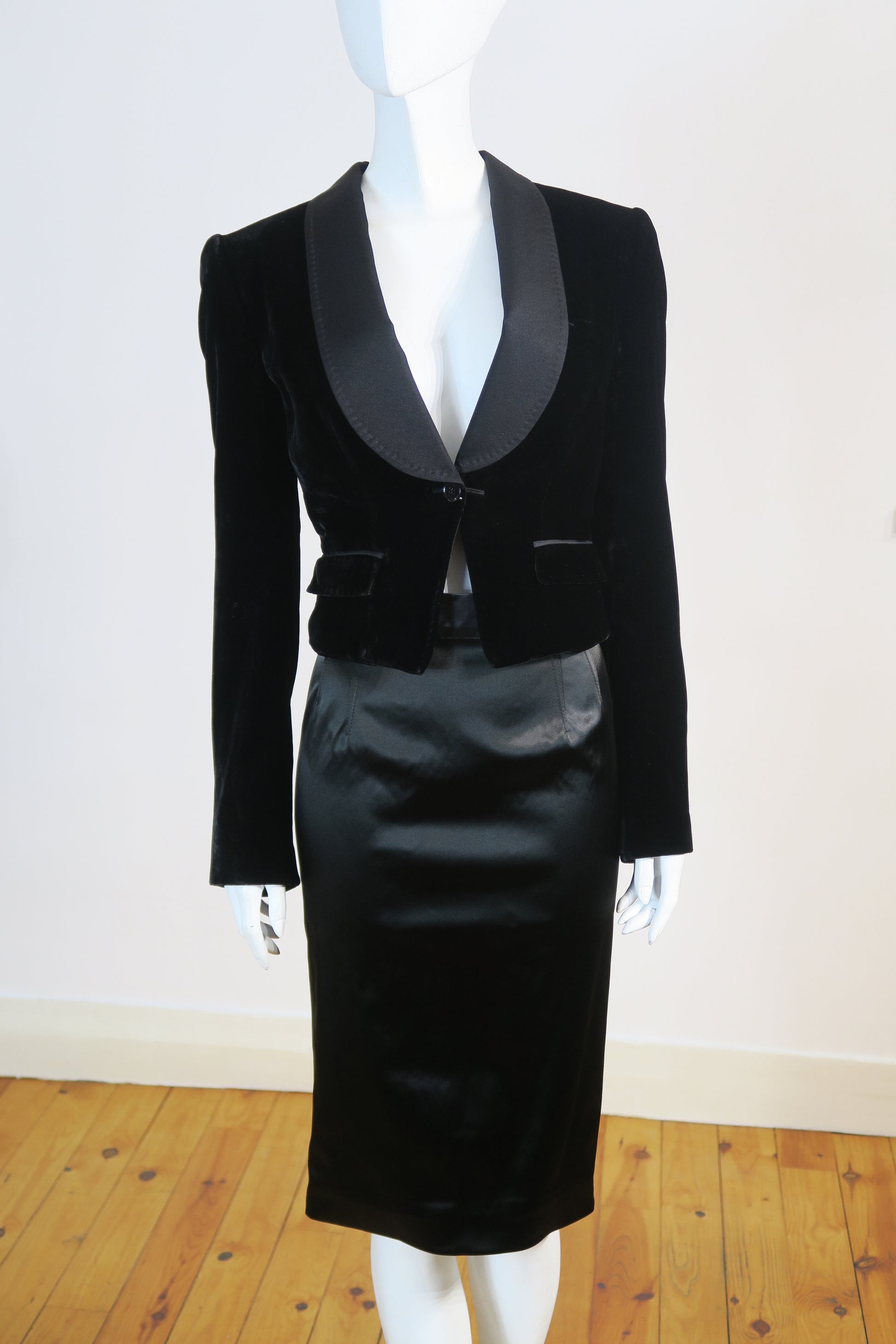 Dolce & Gabbana velour black tuxedo jacket and matching satin black skirt set. Size medium. Never worn.