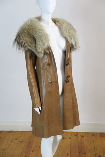 Fendi fall winter 2010 caramel brown coat, long leather trench, toggle button, oversized fur collar. Comes with belt. Size xsmall.