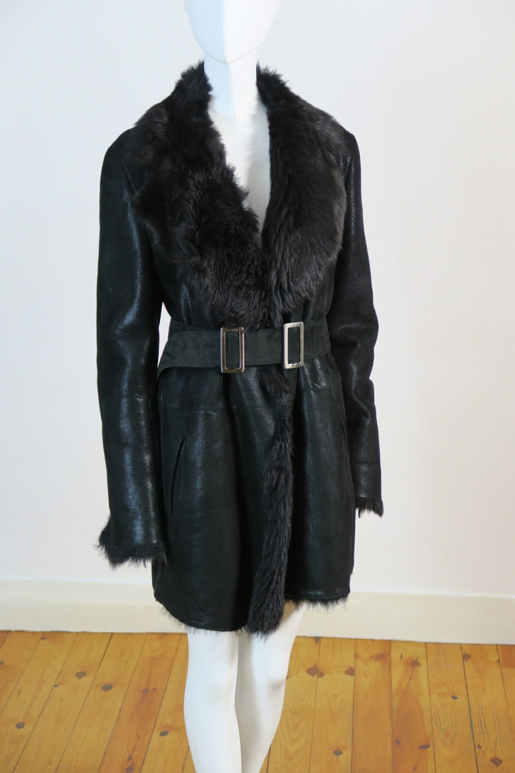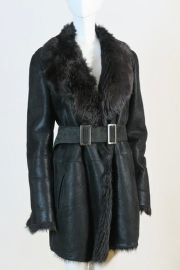 Gucci Tom Ford black shiny leather fur shearling jacket. Size medium. Comes with its belt.
