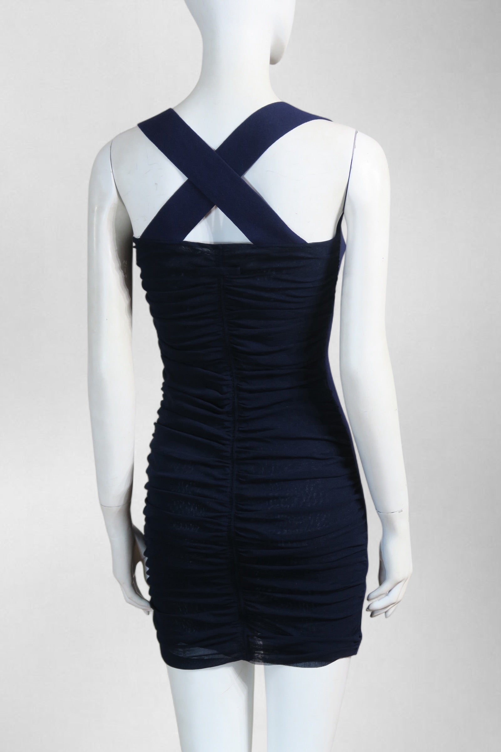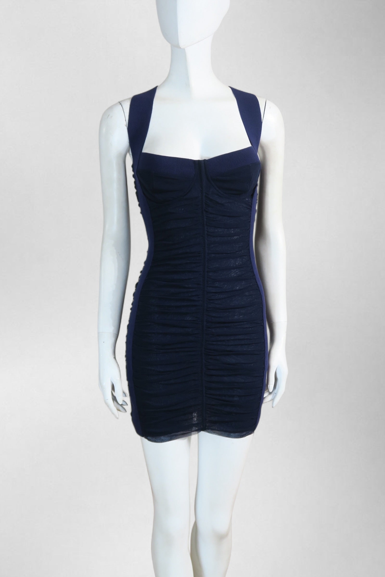 Jean Paul Gaultier navy mesh dress featuring all-over ruching and a body-hugging silhouette with structured straps. Sheer, stretchy and ultra sexy fit. Size S–M.