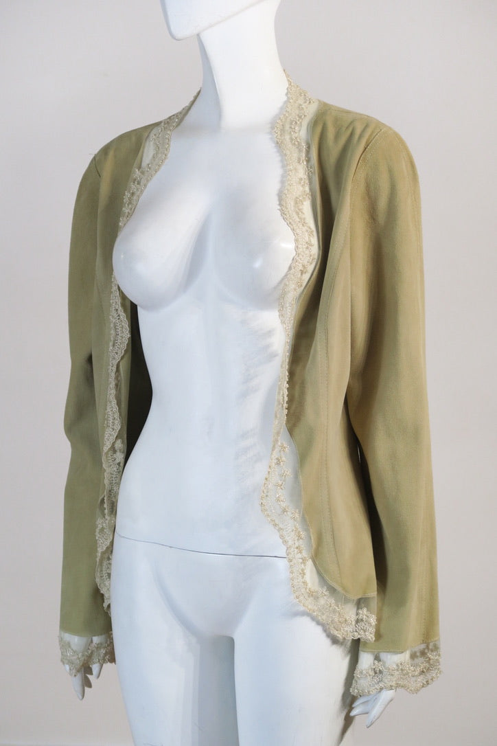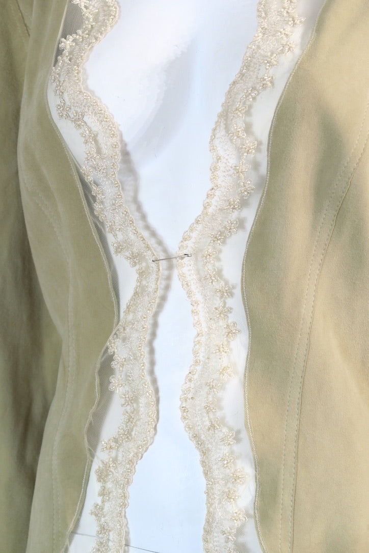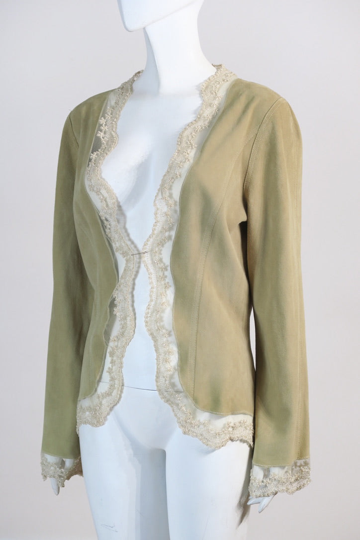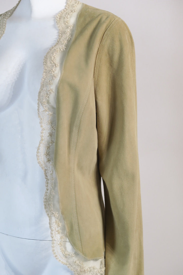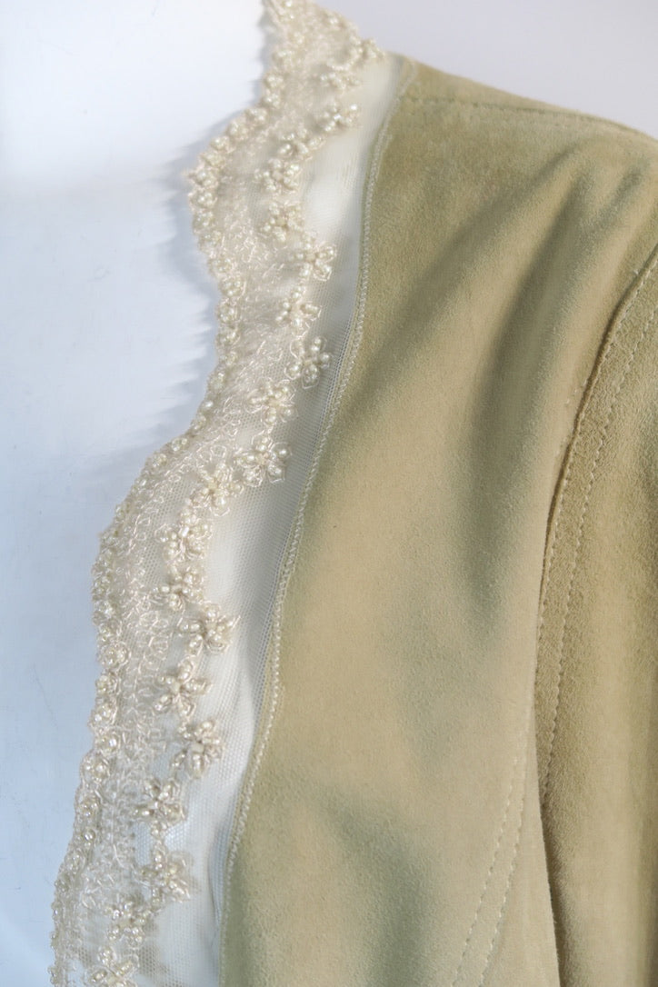 Jiki Monte Carlo suede leather beige, lace pearls embroidered trim. Size medium.