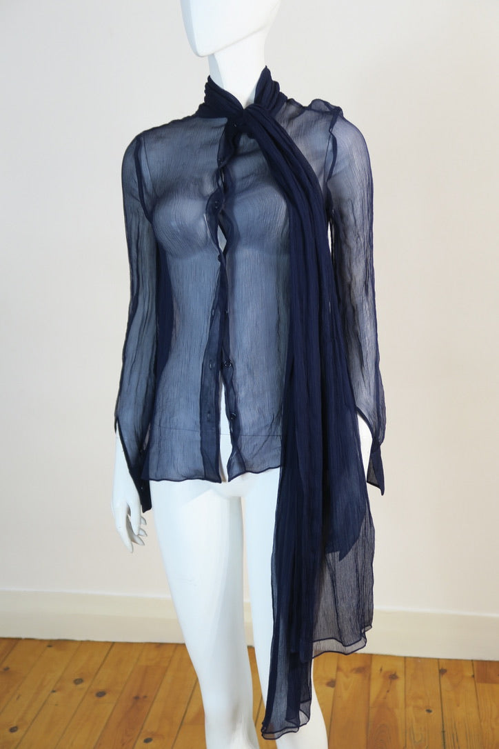 Miu miu blue chiffon silk neck wrap up button down shirt. Size small.