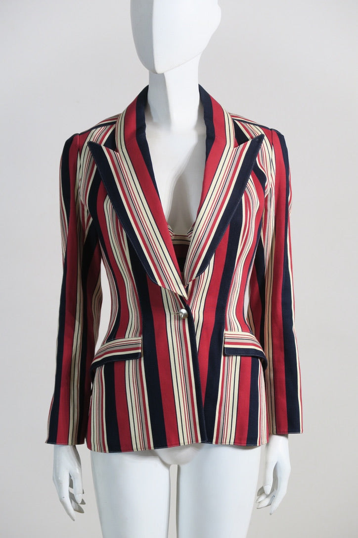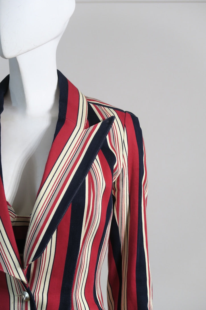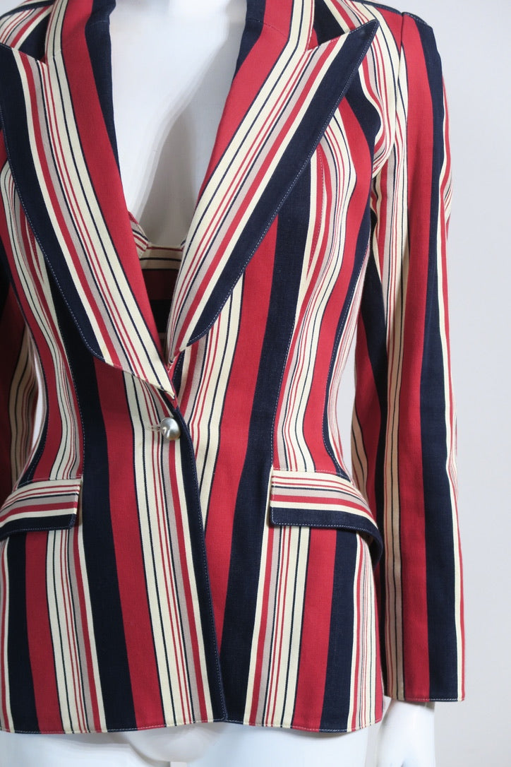 Thierry Mugler Couture set, white blue red stripes print. Includes a bra and a bold shoulder padded iconoc jacket. Size small.