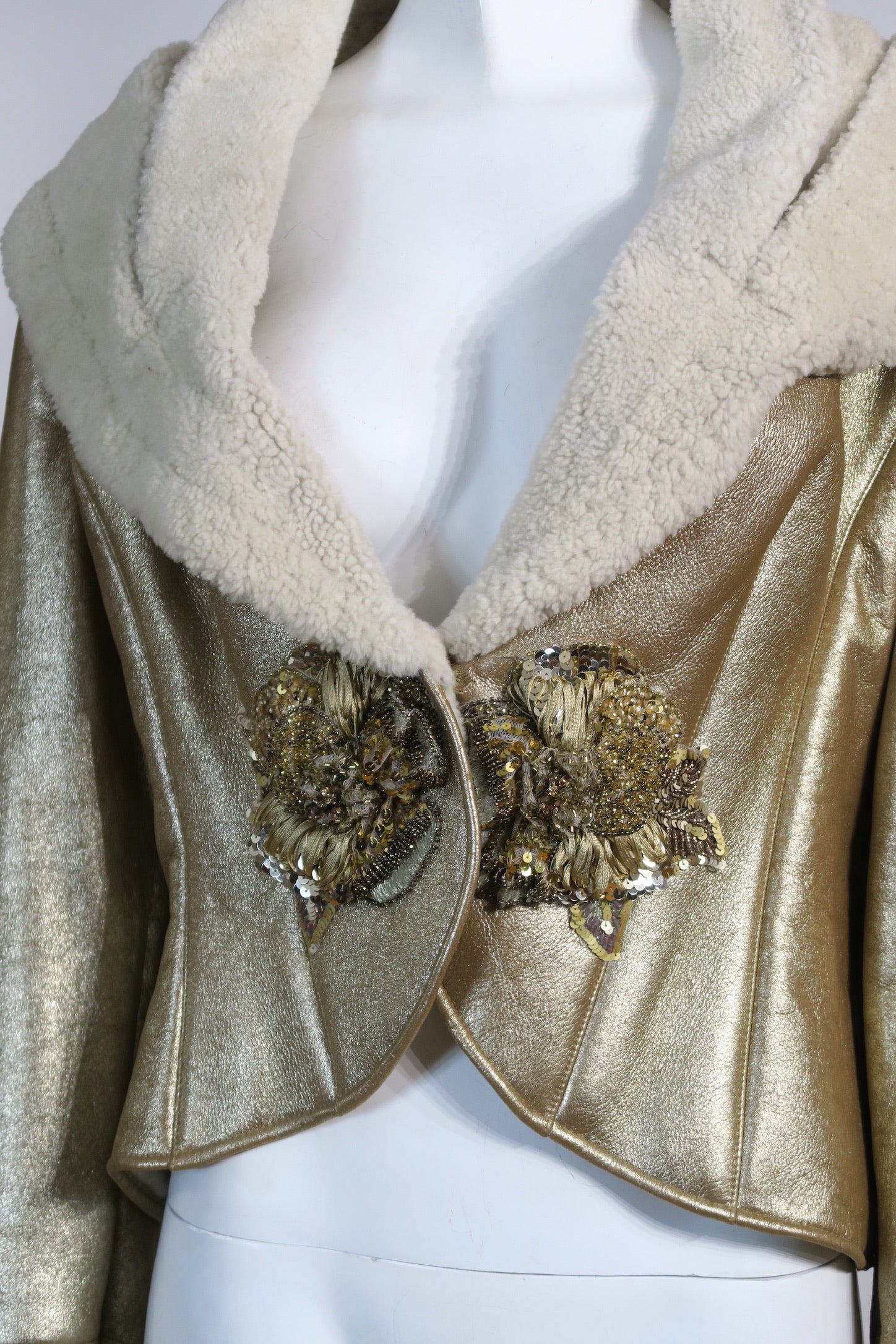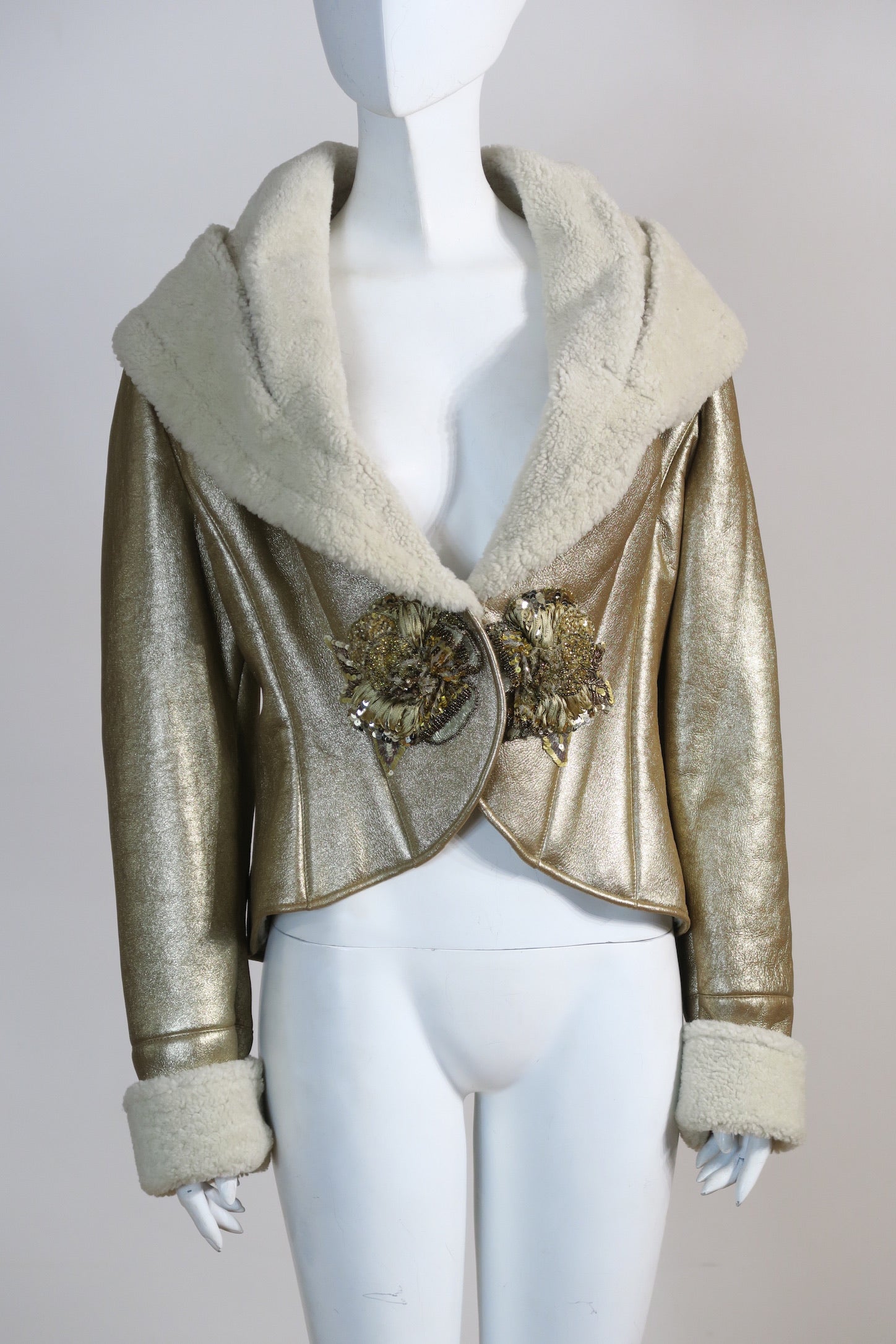 Valentino runway jacket, gold shiny leather, shearling and crystal embellished. Size medium.