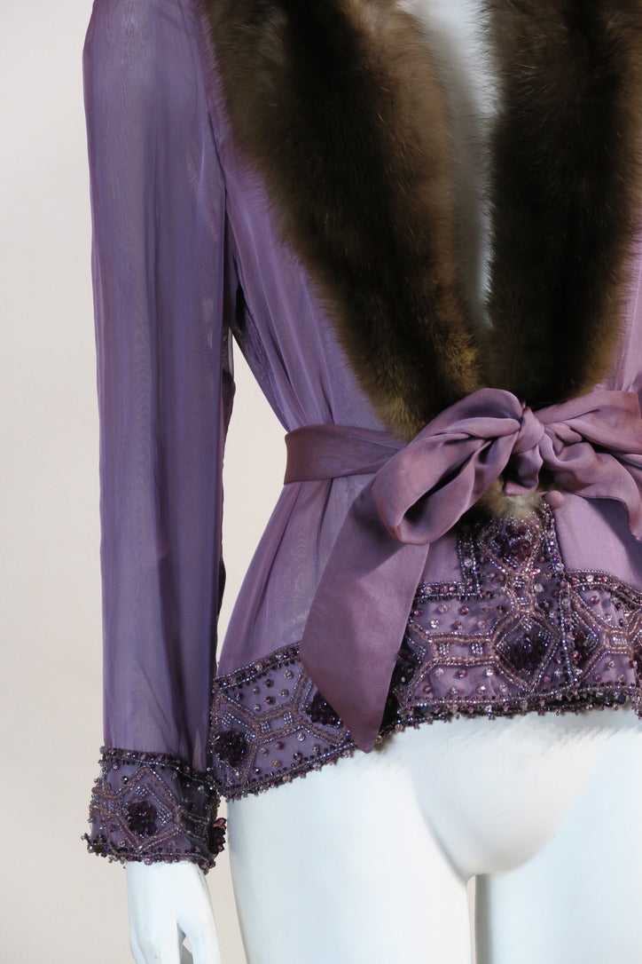 Valentino runway silk top, fur collar, hand beaded crystals. Size medium